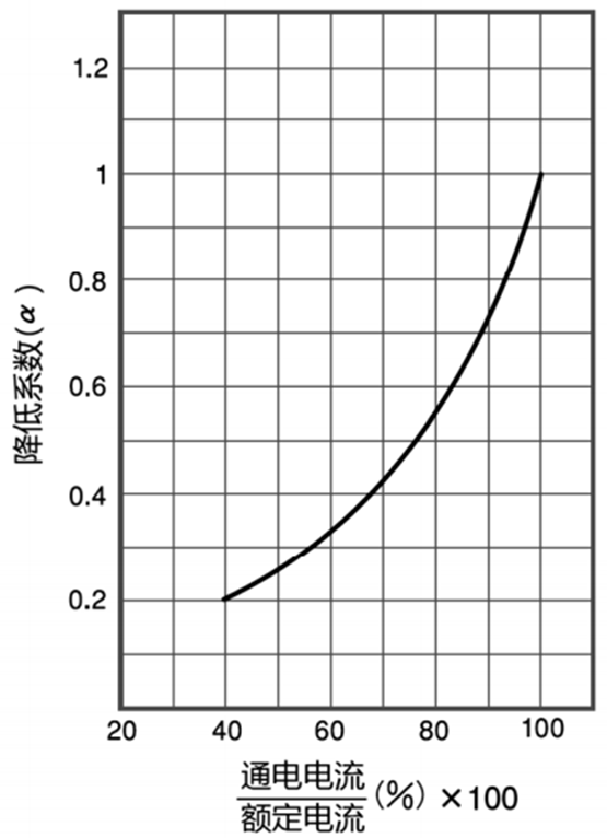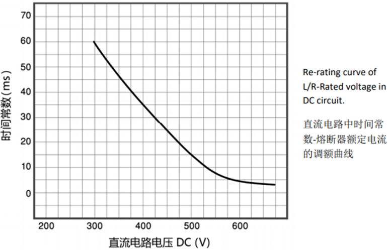 熔斷器工作時容易受到周圍環境及持續通過的電流的影響, 為了延長熔斷器的使用壽命, 必須確保熔斷器的負載電流小于額定電流65%. 當應用于直流回路保護時, 根據直流回路的實際條件, 有時必須確保熔斷器的額定電壓高于回路電 壓(參考下面直流電路的調額曲線 ).