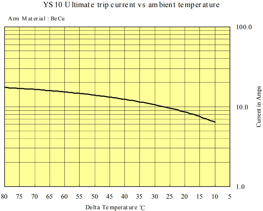 1.上部端子通過4.活動臂、5.活動觸點和6.固定觸點將電流輸送至2.下部端子,該端子插入模制在3.下部塊中。所有零件都用鉚釘固定,用8個孔眼固定。參考圖7。當(dāng)7.雙金屬閥瓣檢測到Y(jié)S10周圍的高環(huán)境溫度時,雙金屬閥盤置于4.活動臂下方,將其向上推,以打開觸點。4.活動臂產(chǎn)生的熱量根據(jù)操作溫度和跳閘電流的組合進行了適當(dāng)設(shè)計。因此,用戶可以為其產(chǎn)品選擇“必須保持電流”的最佳選擇。YS10通過各種方式與端子(孔)結(jié)合安裝,以便在帶電部件和可觸及的金屬部件之間保持足夠的爬電距離和間隙距離。