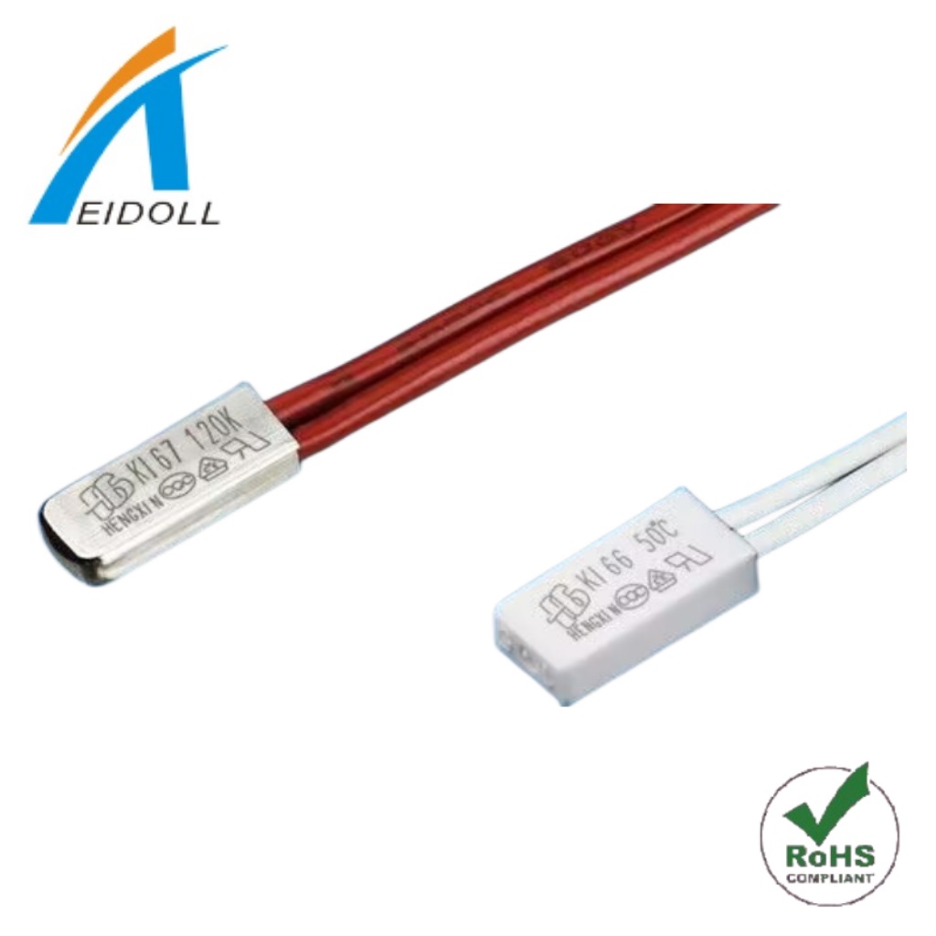 KI66/KI67熱保護器是由導熱金屬外殼/導熱塑料外殼、焊有銀合金觸點有雙金屬元件、導電支架、絕緣固定座、靜觸片及耐熱導線等元件組成。電流通過有阻抗的雙金屬元件,遇非正常工作時,隨電流增大或周圍溫度升高至設定溫度值時,雙金屬元件迅速動作,打開觸點,切斷電路。當裝置冷卻到安全工作溫度時,觸點自動閉合,恢復正常工作狀態。