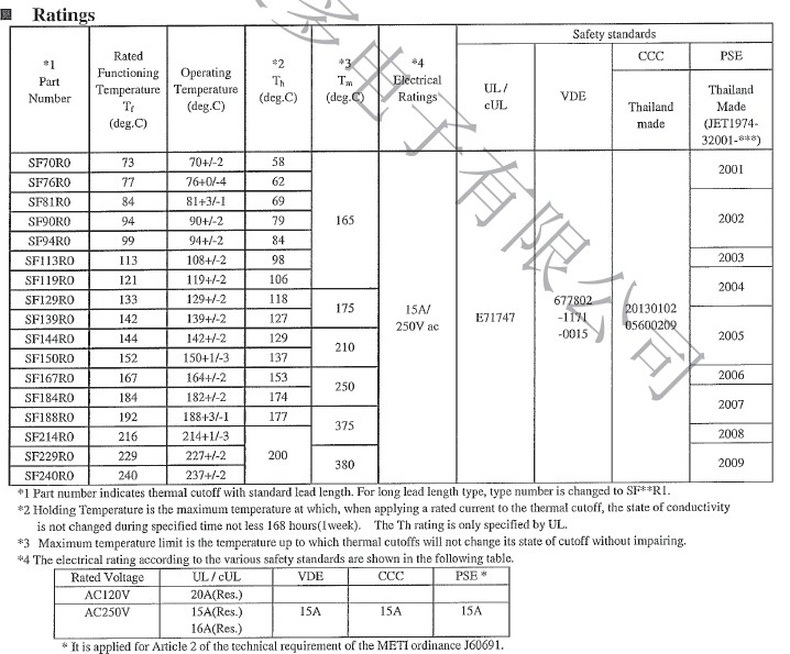 東莞市愛多電子有限公司銷售的NEC、SEFUSE、SCHOTT、 SF-R0系列是NEC、SEFUSE、SCHOTT公司最新推出的AC250V 15A系列,它將逐步替代掉原來的SF-E系列。耐電流高,溫度穩(wěn)定,認(rèn)證齊全。具體型號有:SF70R0,SF76R0,SF81R0,SF90R0,SF94R0,SF113R0,SF119R0,SF129R0,SF139R0,SF144R0,SF150R0,SF167R0,SF184R0,SF188R0,SF214R0,SF229R0,SF240R0等規(guī)格。其中R0表示長短腳,R1表示長-長腳。具體詳細(xì)的參數(shù)如下: