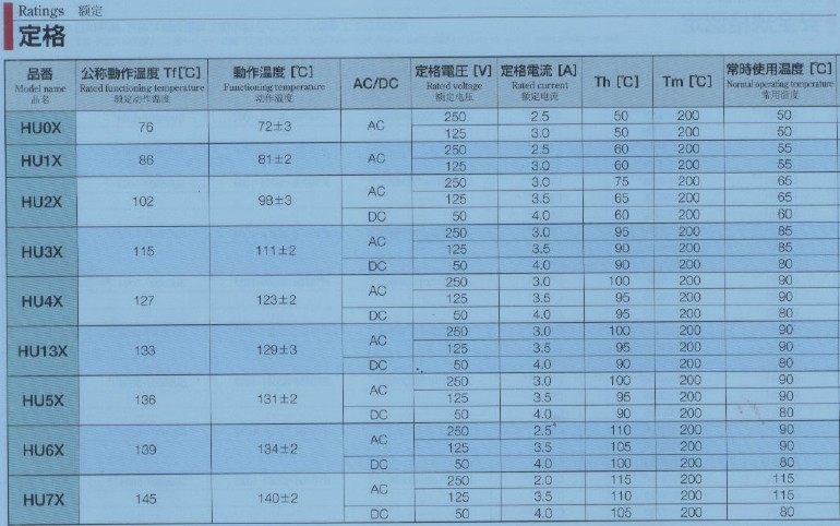 14)HU-X系列,AC250V 2.0A-3.0A/AC125V 3.0-3.5A;具體型號如下: