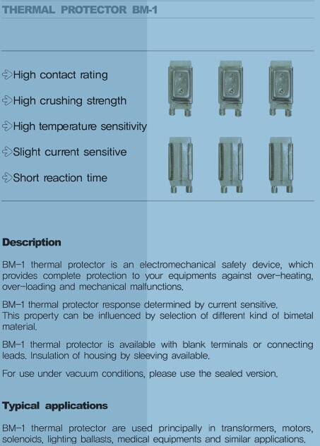 Dongguan Eidoll Elect. Limited sales the thermistat of MCS、BTK,The products have BM1、BM2、BM3 three series,BM-1has BM-1W(High Resistor type)、BM-1U(Low resistor type)、BM-1S(Self holding type),Usually we can use the BM-1S serie。BM2(compact type)have BM-2W(High resistor type)、BM-2U(Low resistor type)、BM-2S(Self holding type),If you want to get the information of BM-3,please let me know。The terminal have A and B ,such as BM-1S-065A and BM-1S-065B each have not same terminals。 the temperature from 30C to 180C can product.